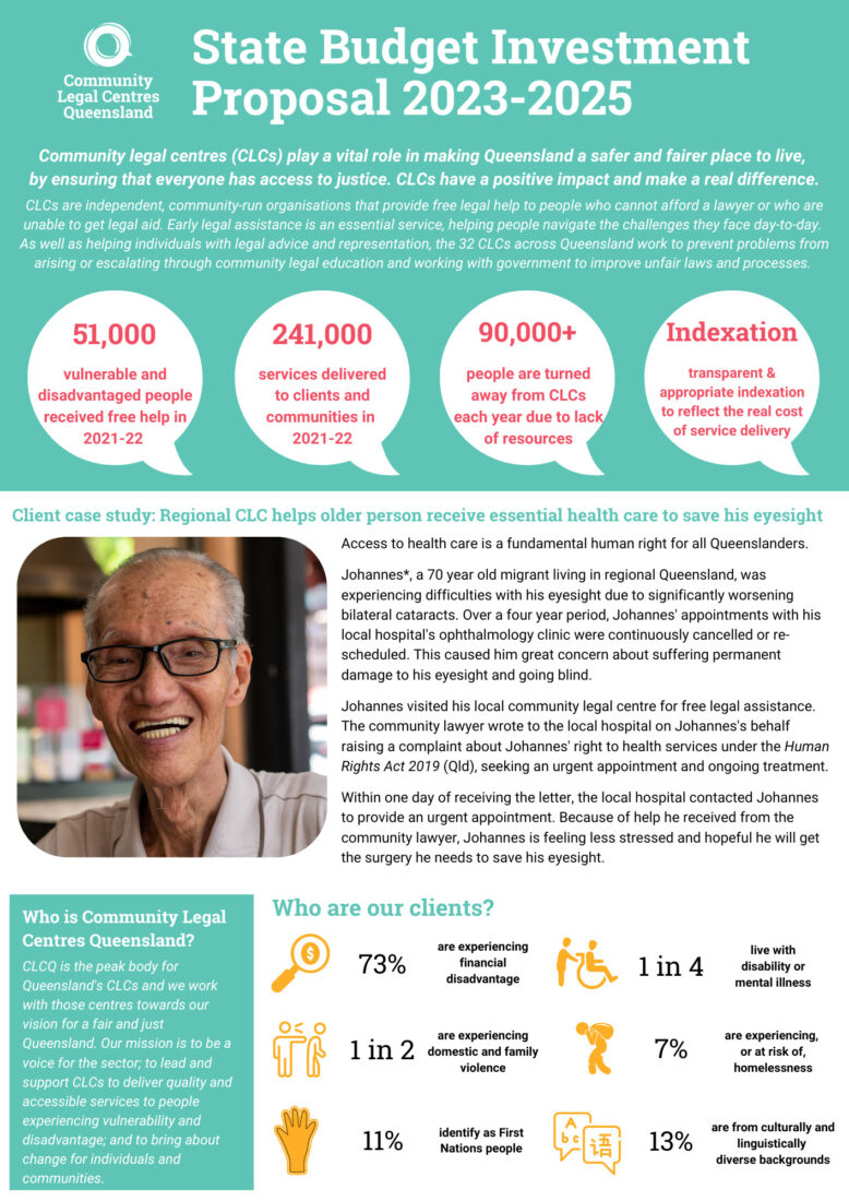 Ahead of the 2023 State Budget, Community Legal Centres Queensland is calling on the State Government to invest an additional $18 million per annum plus indexation into Queensland CLCs over the next two years.