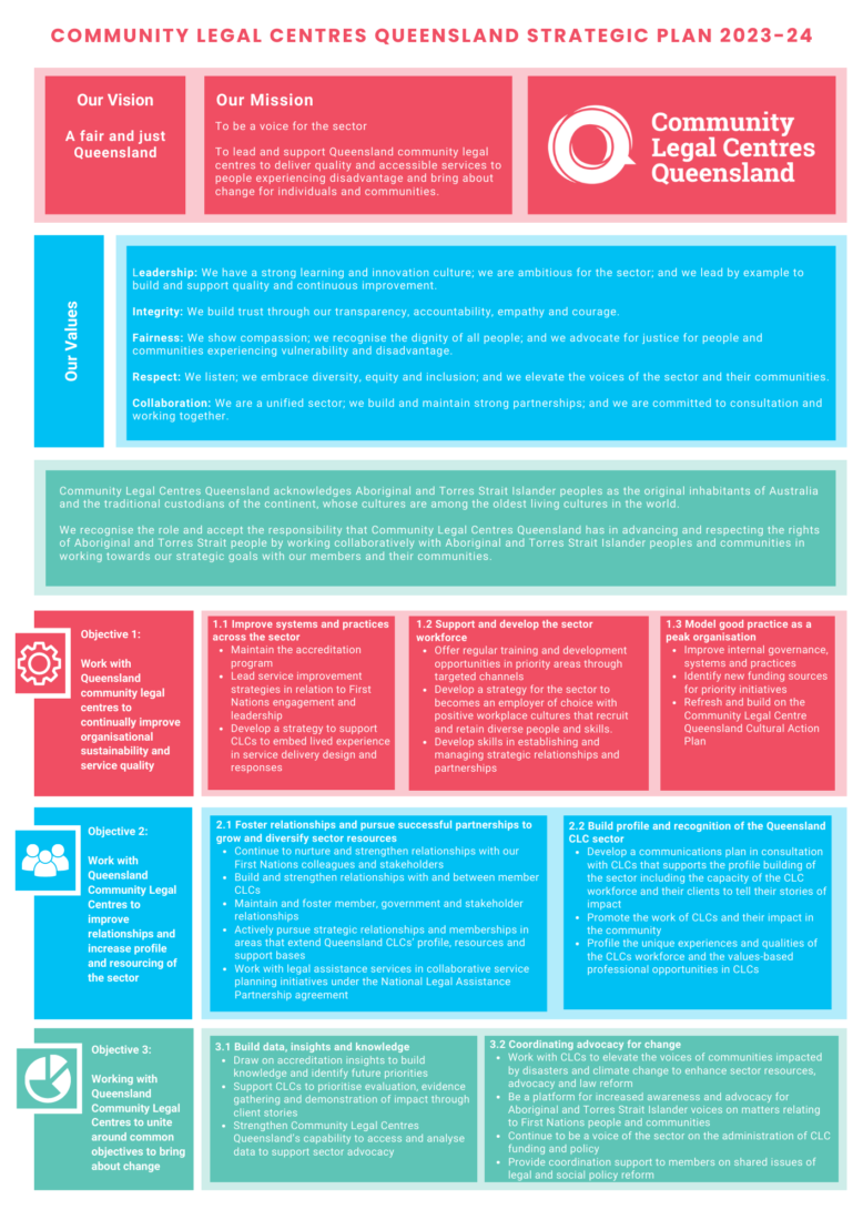 The Strategic Plan outlines Community Legal Centres Queensland’s three main objectives: